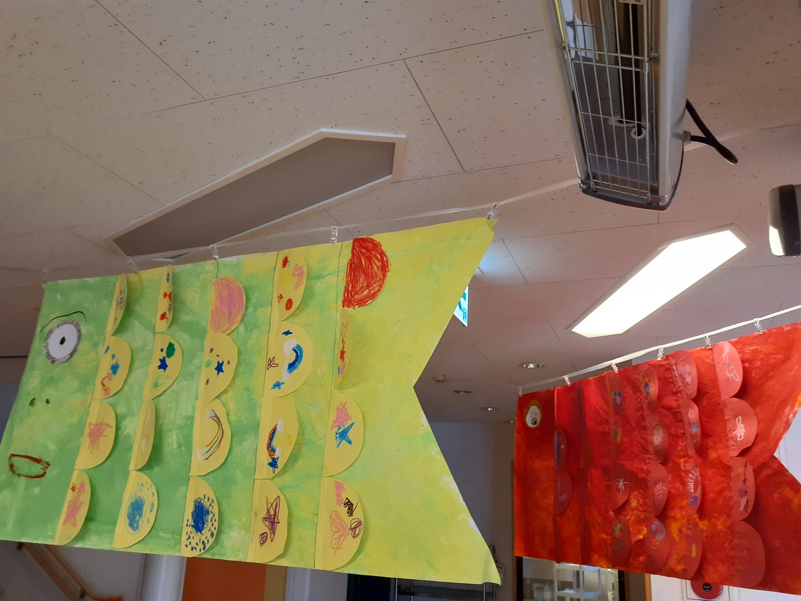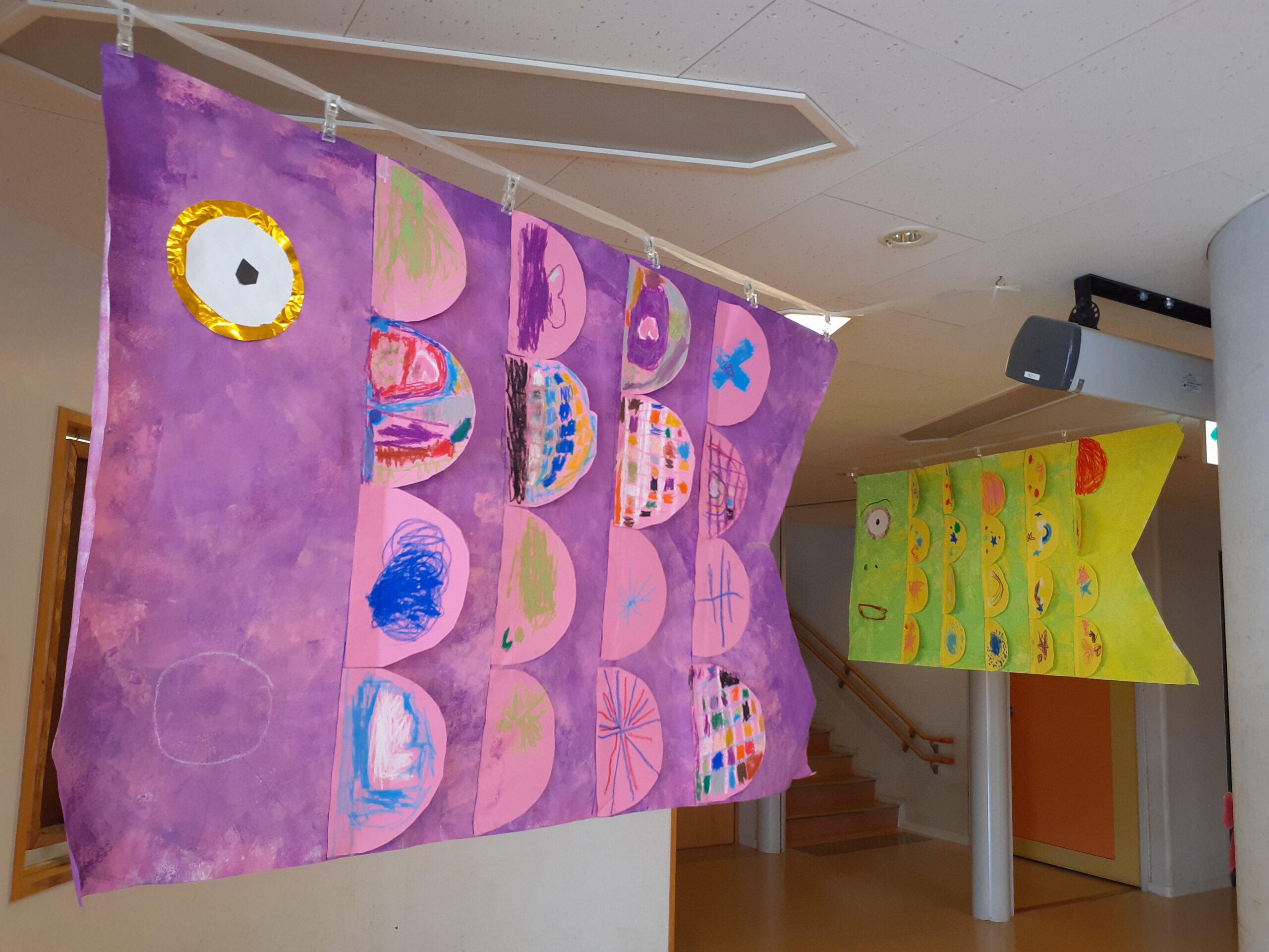 また、5歳児クラスは鱗のデザインを描いたあと「ヒラヒラしていると泳いでるみたい」と子どもたち自身で貼り方を考えていました。