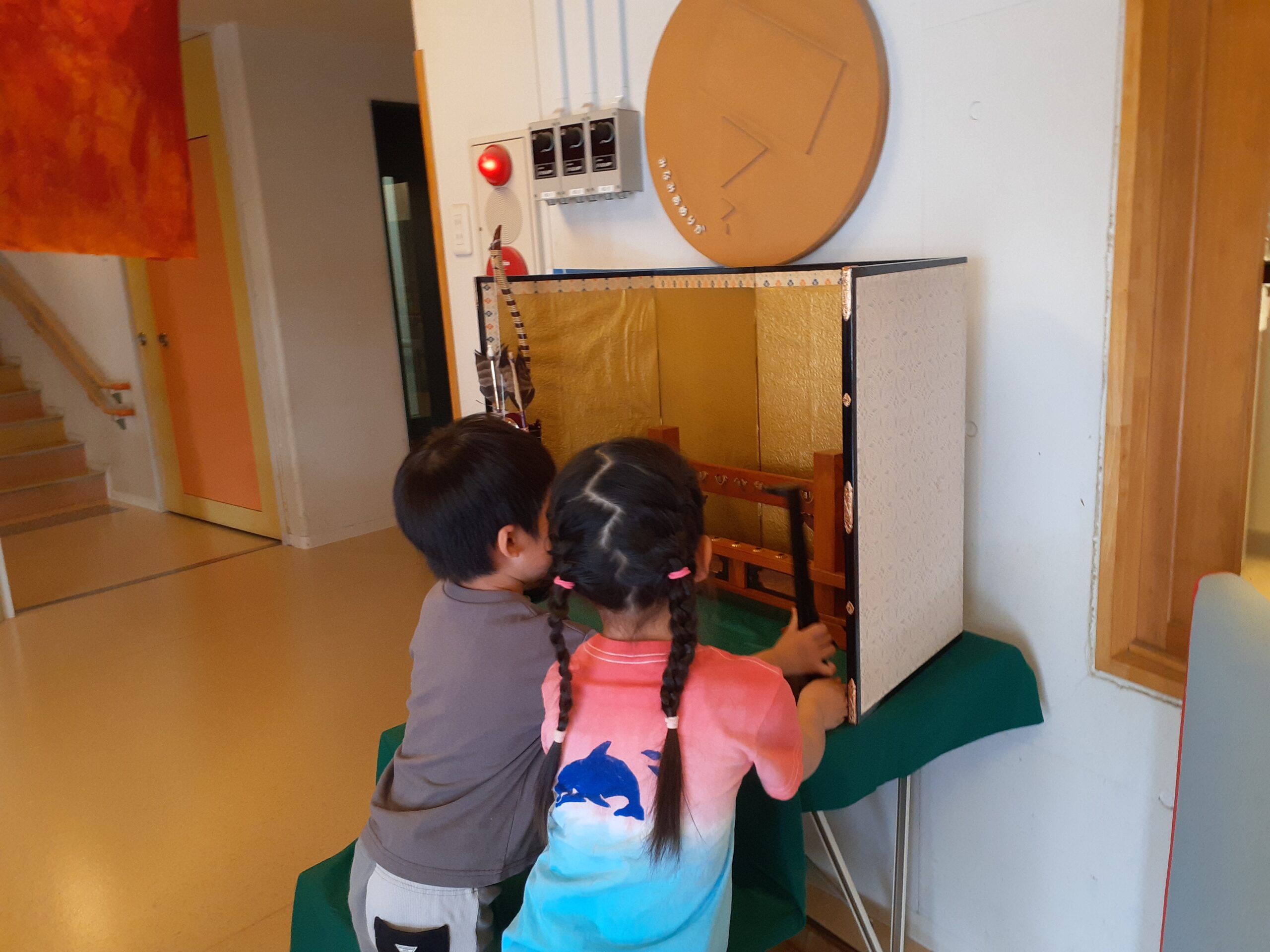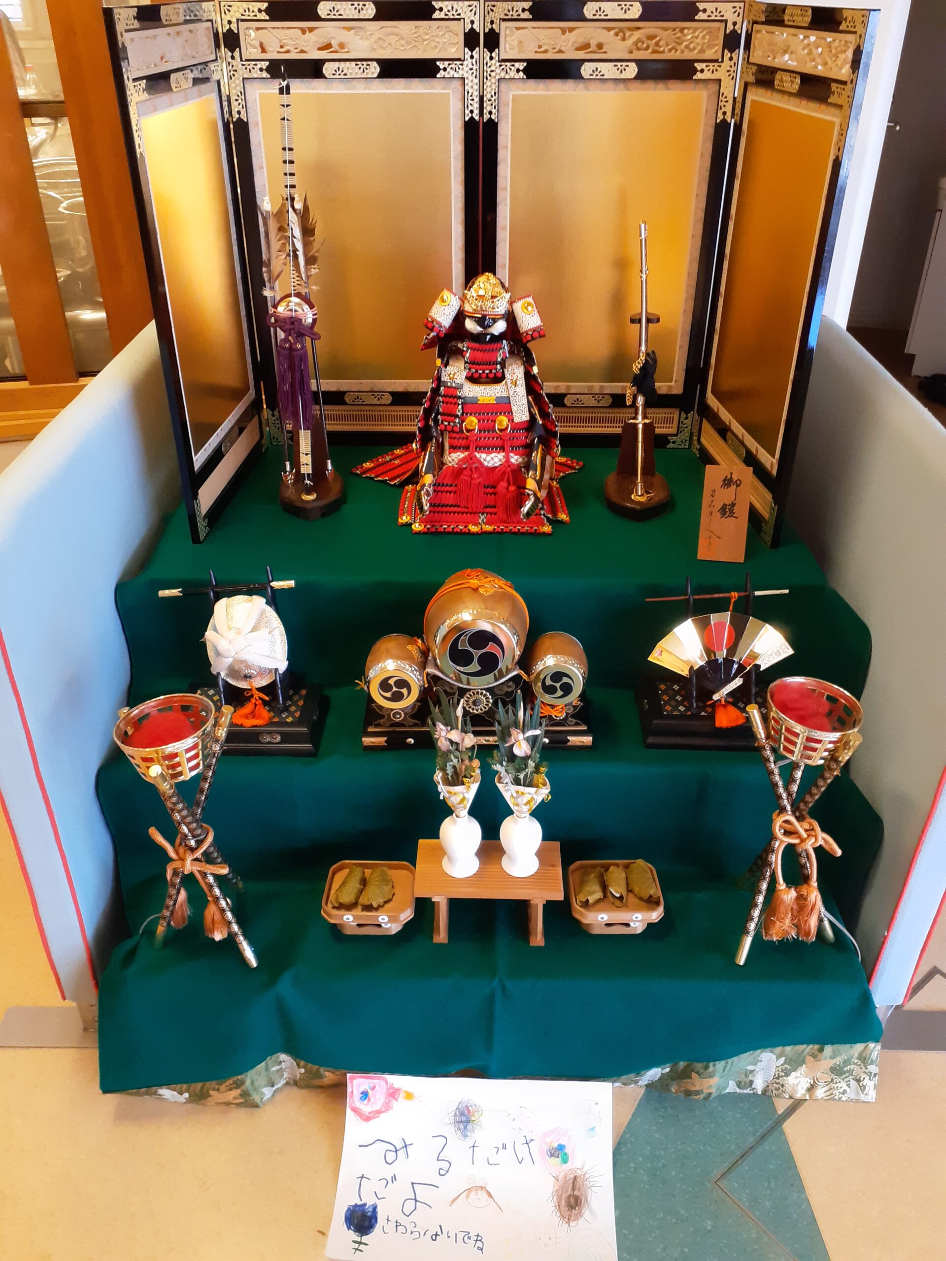 その後、5歳児クラスの子どもたちと毎年の恒例である五月人形の飾りつけを行いました。