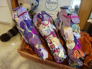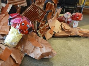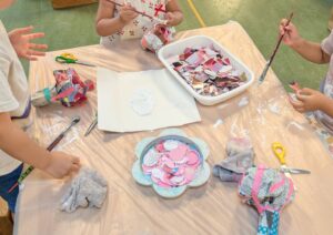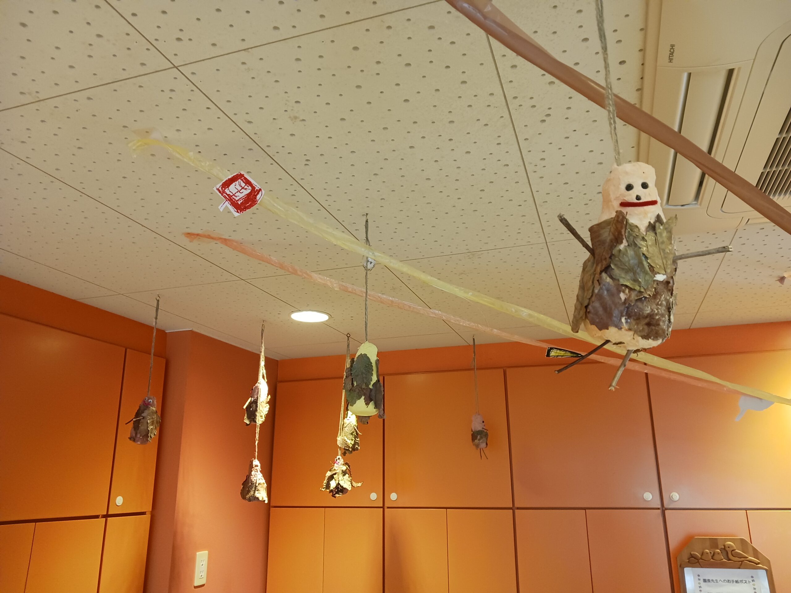 様々な素材の紙を使って秋の食べ物や自然物を使ってのミノムシが出現。