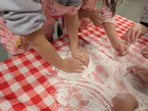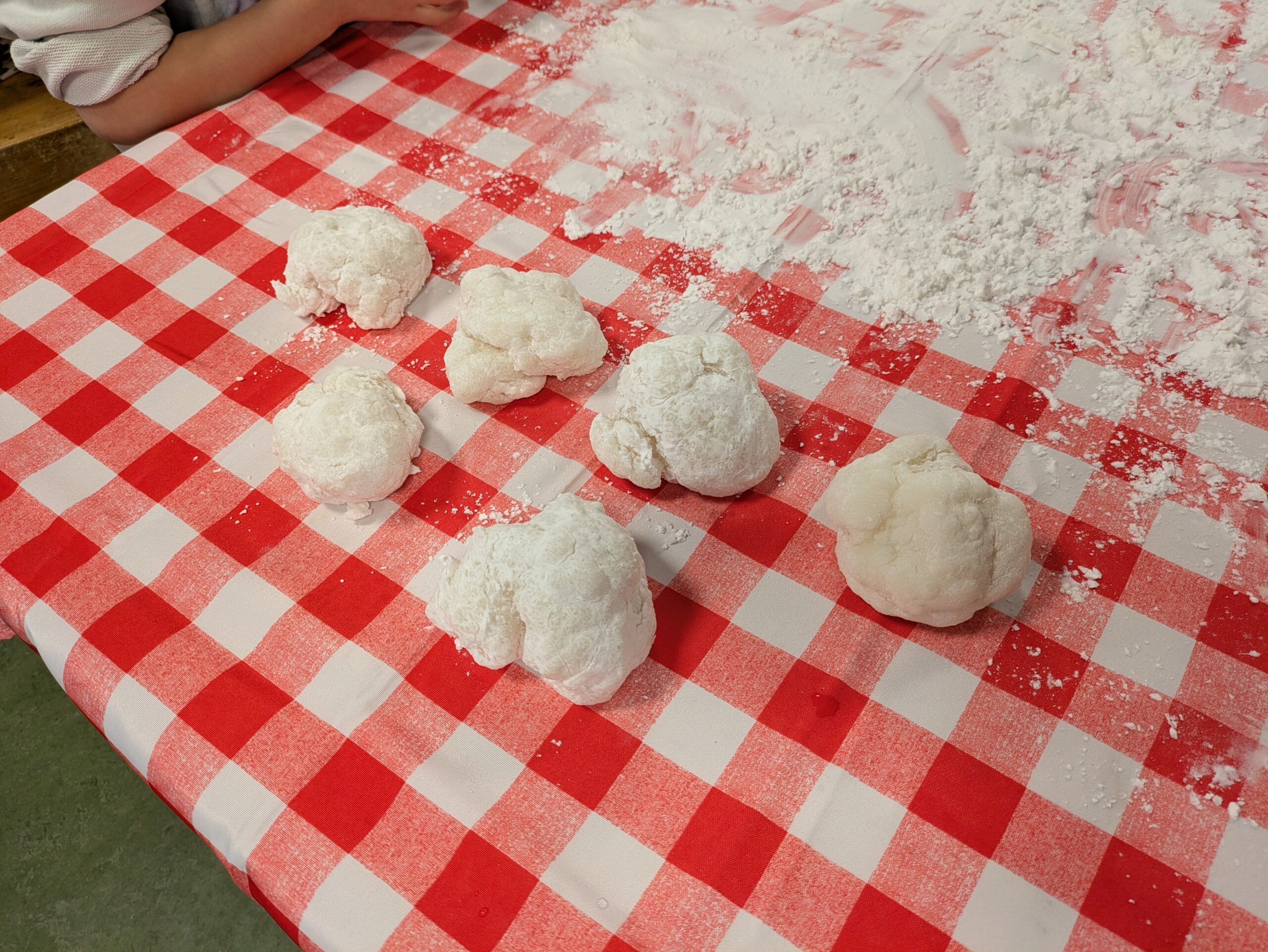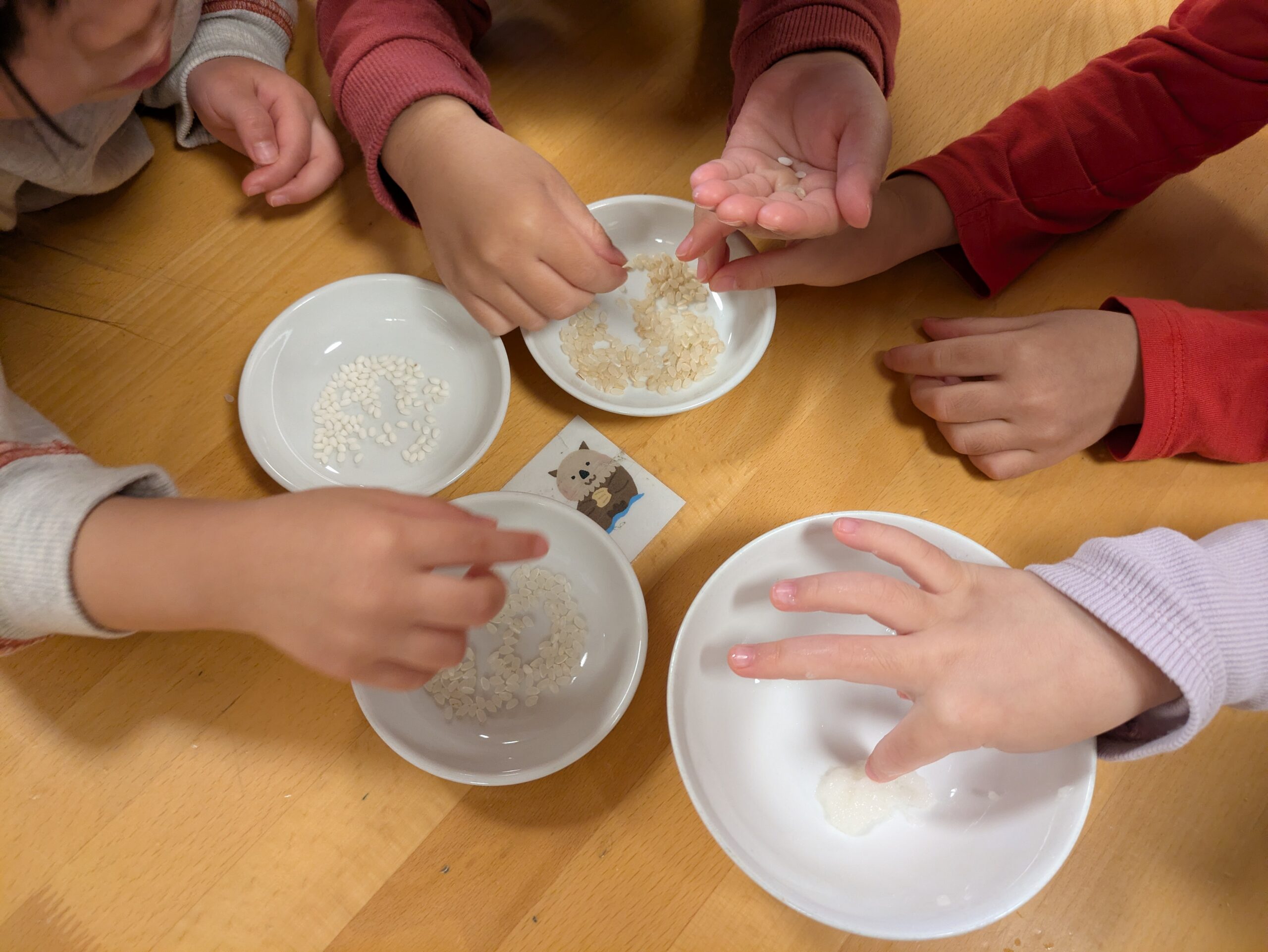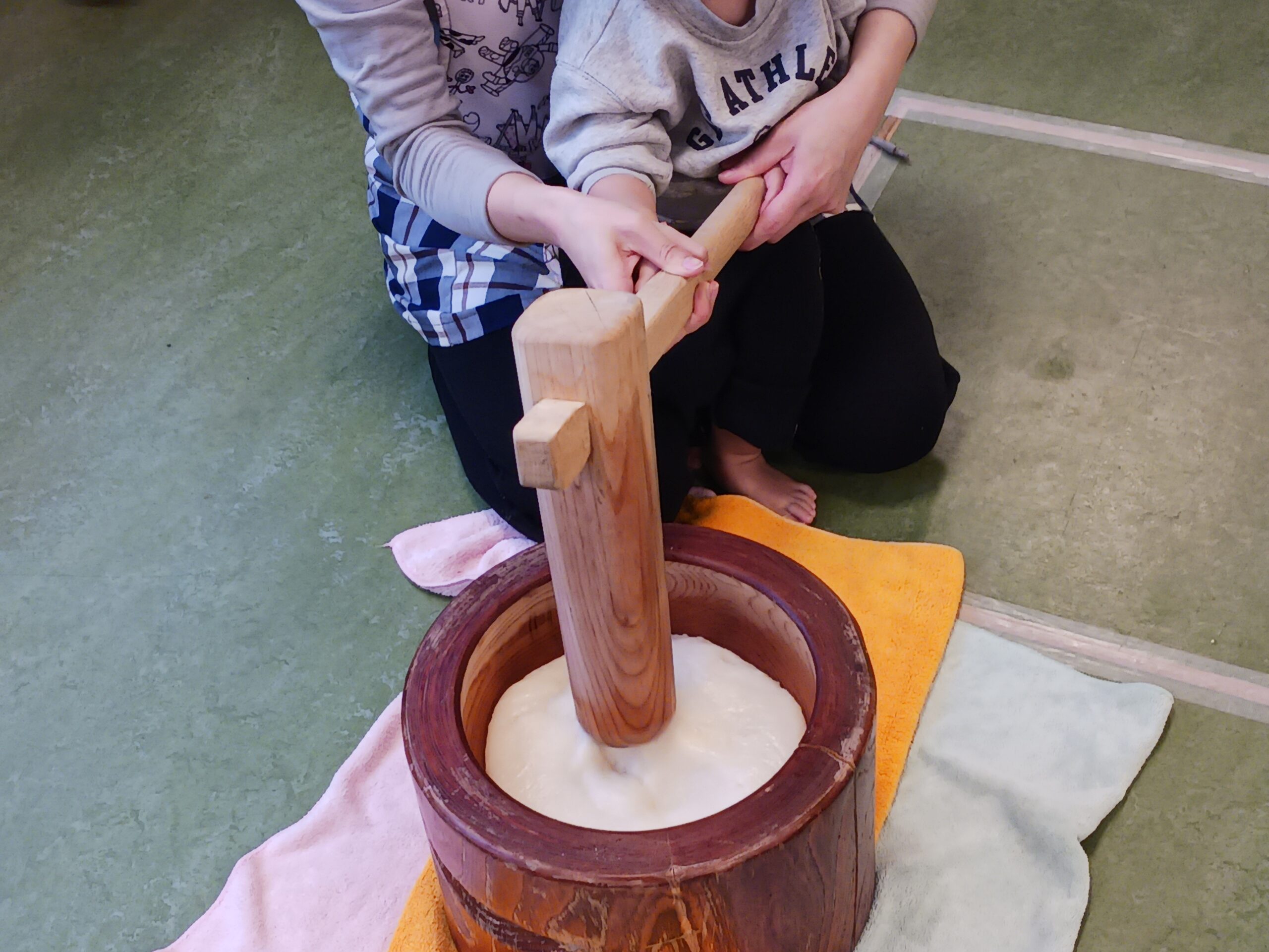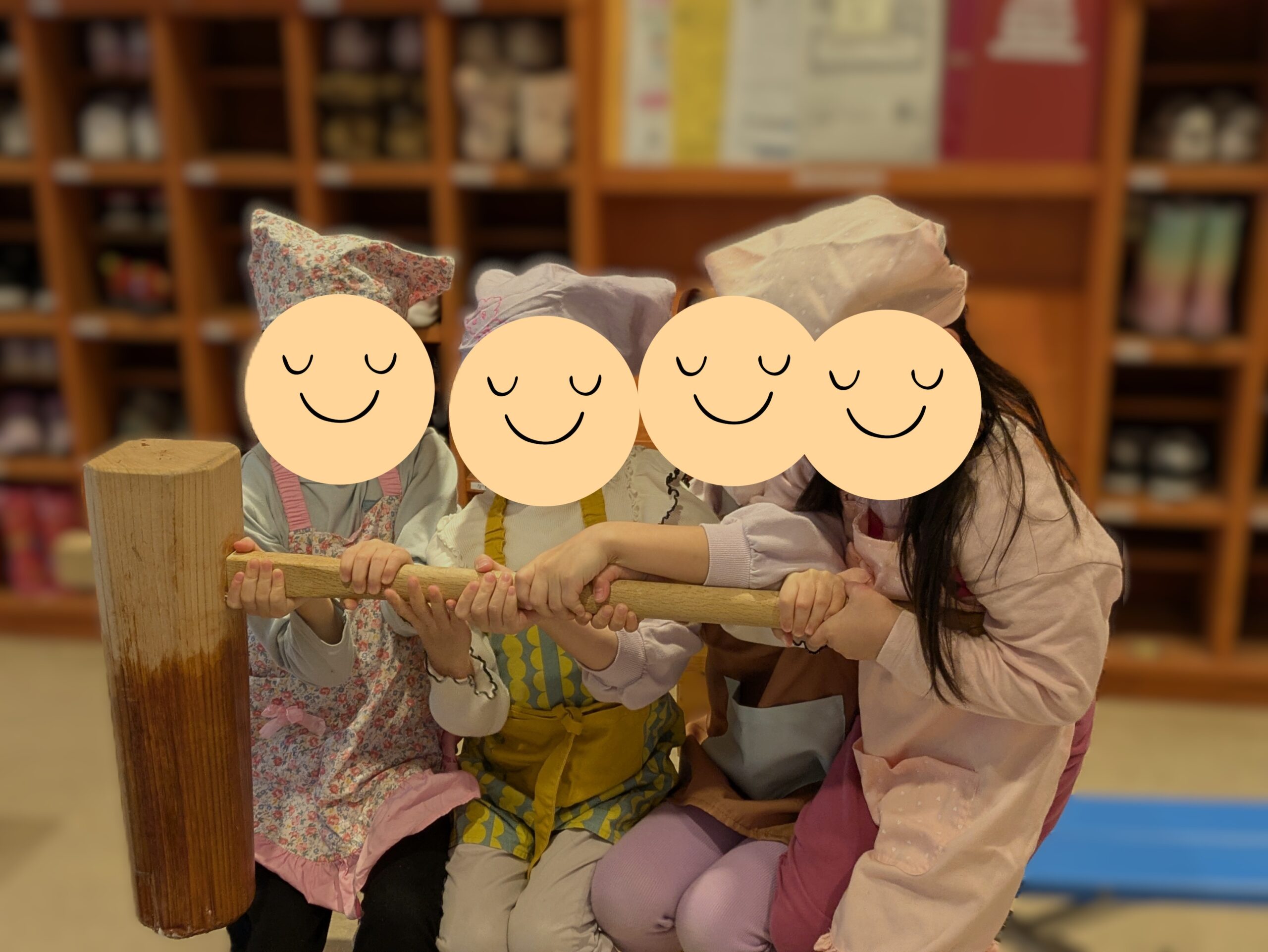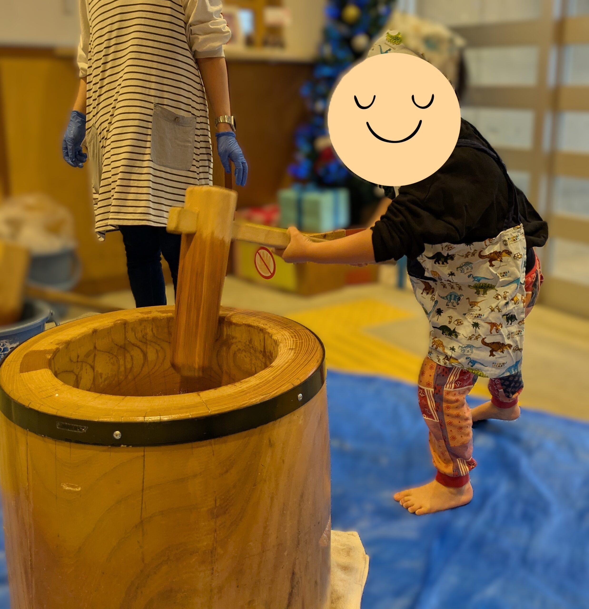 ついたお餅で、年長児が鏡餅作りに挑戦。