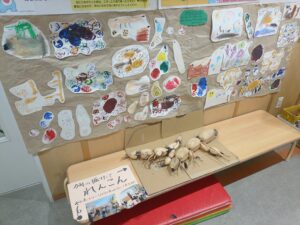 れんこんにも触れ、つながった節を折ってみて感触や音を楽しむことや、れんこんのクレヨン画制作なども行っています。